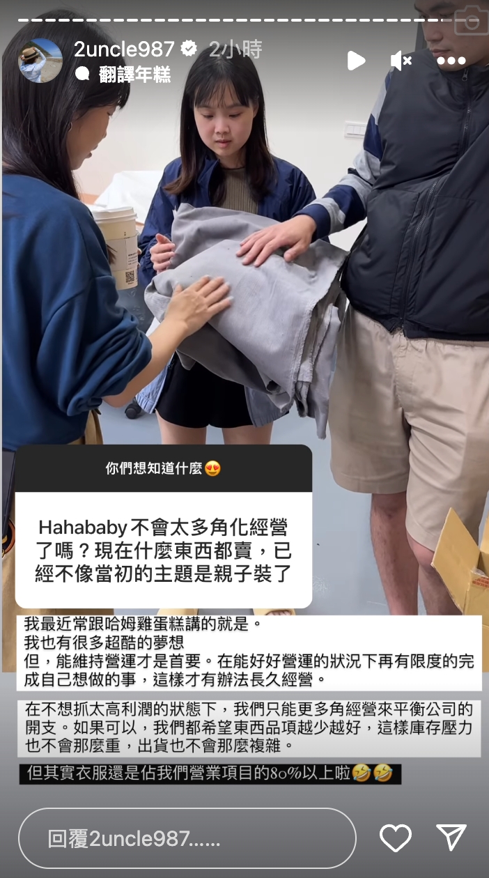 針對有人詢問「hahababy不會太多角化經營了嗎?」二伯表示經營公司最重要的事維持營運,「在能好好營運的狀況下,再有限度的完成自己想做的事,這樣才有辦法長久經營。」在不想高利潤的狀態下,就只能透過多角化經營來平衡公司的開支,她坦言:「如果可以,我們都希望東西品項越少越好,這樣庫存壓力也不會那麼重,出貨也不會那麼複雜。」