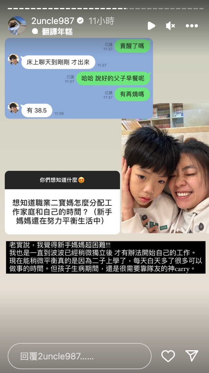 此外,有網友身為新手媽媽,好奇二伯究竟是怎麼在家庭跟工作之中取得平衡,二伯則表示:「我覺得新手媽媽超困難!我也是一直到波波已經稍微獨立後,才有辦法開始自己的工作。」再加上兩個小孩子都已經開始上學,白天多了很多自己的時間可以做事,不過孩子只要生病,還是會需要神隊友的幫忙。