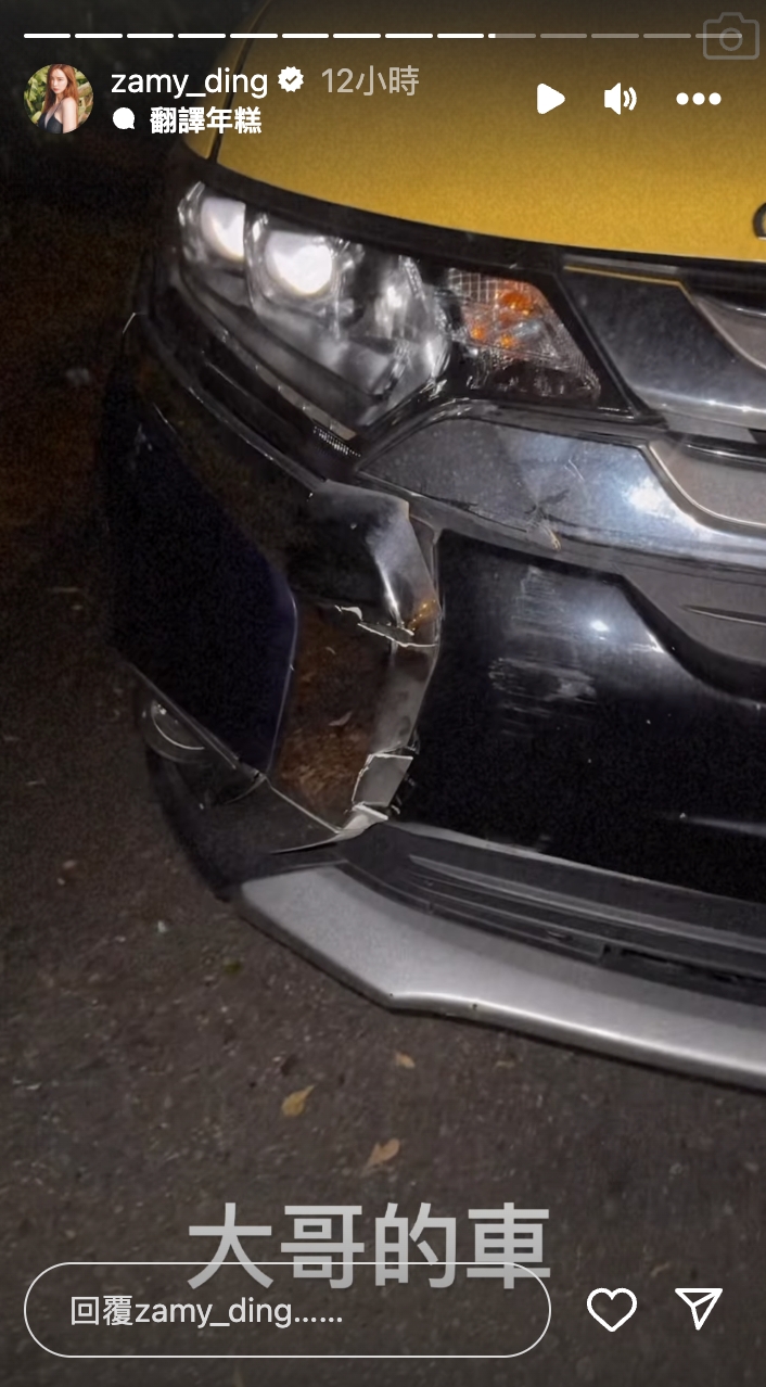 奎丁19日在IG分享事故發生的經過,她表示:「剛才前面有人在高速公路上面急煞」,結果後方的計程車因煞車不及而撞上來,導致車子的左後方鈑金凹了一個大洞,計程車右前方鈑金也難以倖免。在看完行車記錄器後,奎丁苦中作樂地笑說:「司機大哥QQ~」司機大哥懊惱表示:「怎麼突然間急煞呢!」後續還做了酒測,數值皆為零。