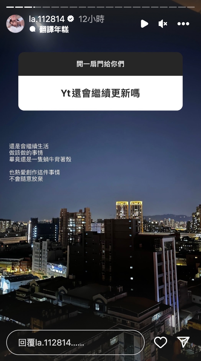 蕾菈21日在IG限時動態曬出跟湯宇在外面散步的照片,雖然光線昏暗,看不清楚兩人的表情,但可以看見她靠在老公的肩上並對著鏡子拍照,她在內文中表示:「多了很多時間談戀愛。」接著又開放問答跟網友互動,她分享最近幾乎都待在家,「沈澱、思考、運動,還有把很多想做沒做的事情做完,陪小孩跟貓狗。」為了生活,之後還是會繼續更新影片,除了身上有房貸之外,也是因為熱愛創作,所以不會隨意放棄,也透露還會再休息一陣子。