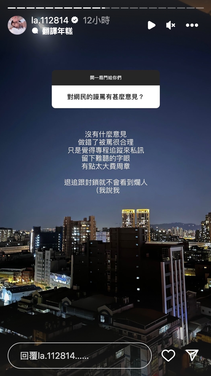 至於「對網民的謾罵有什麼意見」,蕾菈坦言:「做錯了被罵很合理,只是覺得專程追蹤來私訊,留下難聽的字眼有點太大費周章,退追跟封鎖就不會看到爛人(我說我)。」她表示很後悔一開始就選擇說謊,也因此學到一課,「人在恐懼害怕時,都要學會勇於承擔錯誤,一切都是咎由自取。」不過還有酸民要她「跳下去」,她直言:「罵人是完全可以的,但這樣的惡意真的不太好。」