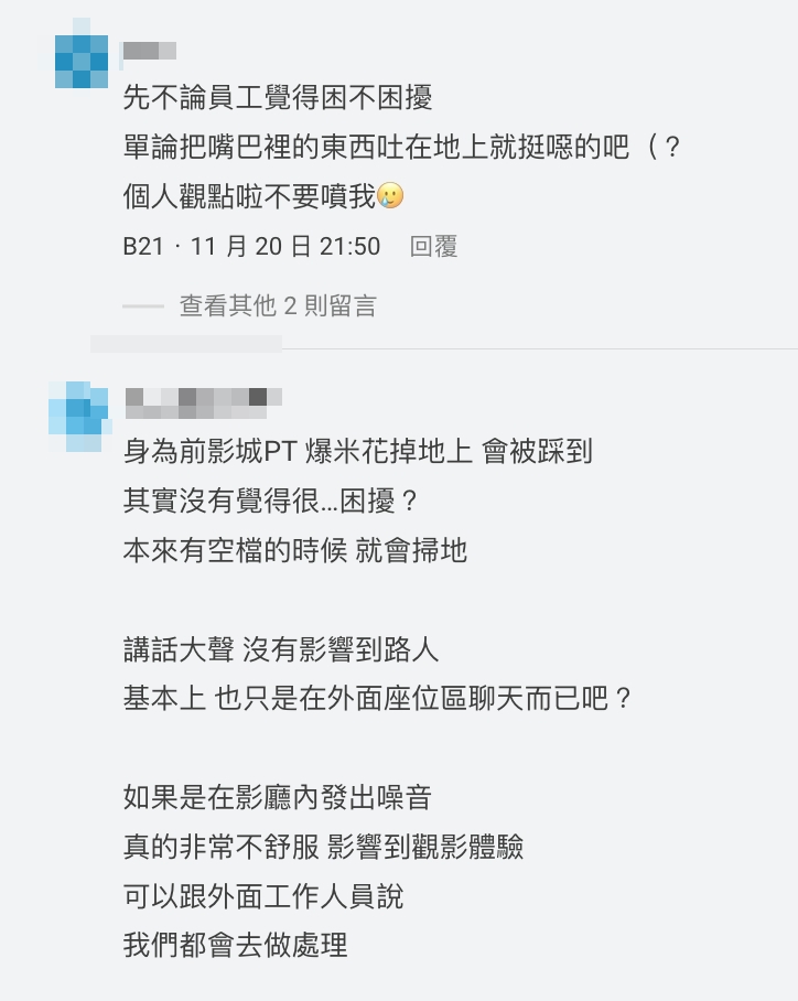 文章曝光後,立刻掀起熱烈討論,有人表示:「先不論員工覺得困不困擾,單論把嘴巴裡的東西吐在地上就挺噁的吧?」、「吐爆米花籽超級沒公德心的啊,誰做都一樣,不是這件事常見就沒差欸。」