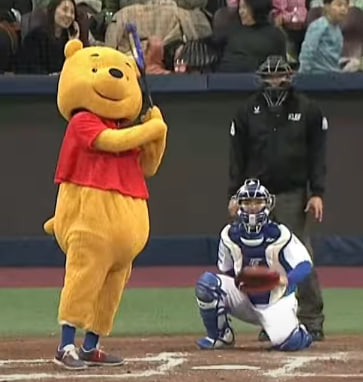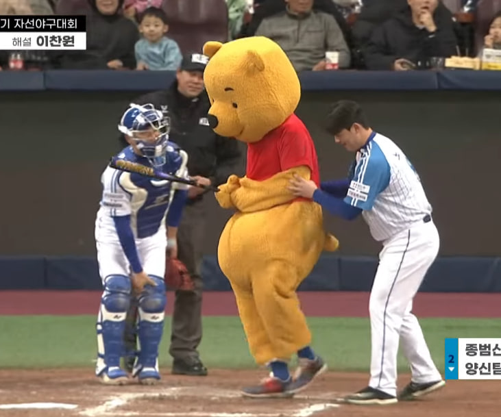 小熊維尼竟然這麼會打棒球?韓國職棒慈善棒球賽球員穿維尼吉祥物服夯深遠長打