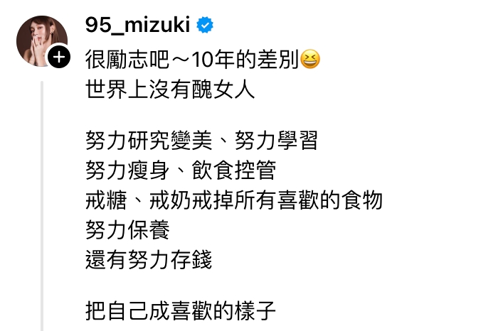 針對被網友翻出高中時期的青澀照一事,林襄27日在Threads回應:「很勵志吧~10年的差別!世界上沒有醜女人。」她透露這些年努力研究如何變漂亮跟努力瘦身,為了維持身材,不僅戒糖跟戒奶,就連很多喜歡的食物都必須忌口,只為了「把自己變成喜歡的樣子」。