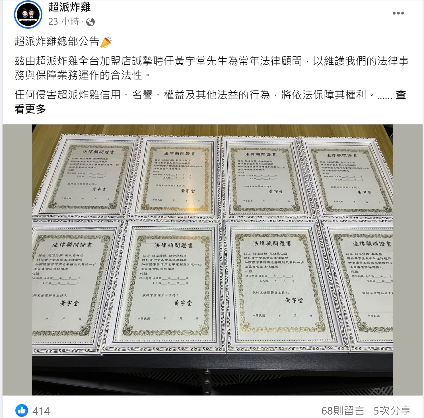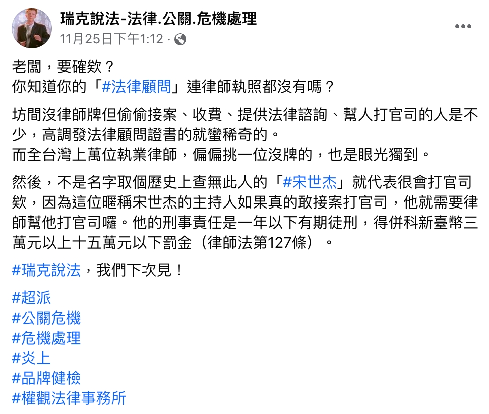 超派炸雞日前在粉絲專頁曬出「法律顧問證書」,並宣布娉任黃先生擔任法律顧問,「以維護我們的法律事務與保障業務運作的合法性」。不過,瑞克律師對於所謂的「法律顧問」提出質疑,「老闆,要確欸?你知道你的『法律顧問』連律師執照都沒有嗎?」他表示民間有很多人沒有律師執照,但是卻偷偷接案、收費、提供法律諮詢以及幫忙打官司,更吐槽:「全台灣上萬位執業律師,偏偏挑一位沒牌的,也是眼光獨到。」