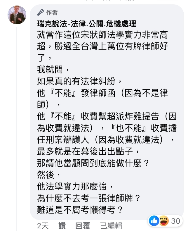 不僅如此,瑞克律師更指出,「如果真的有法律糾紛,他『不能』發律師函(因為不是律師),他『不能』收費幫超派炸雞提告(因為收費就違法),『也不能』收費擔任刑案辯護人(因為收費就違法),最多就是在幕後出出點子,那請他當顧問到底能做什麼?」不解黃姓顧問如果法學實力真的這麼強,為何不直接去考照。