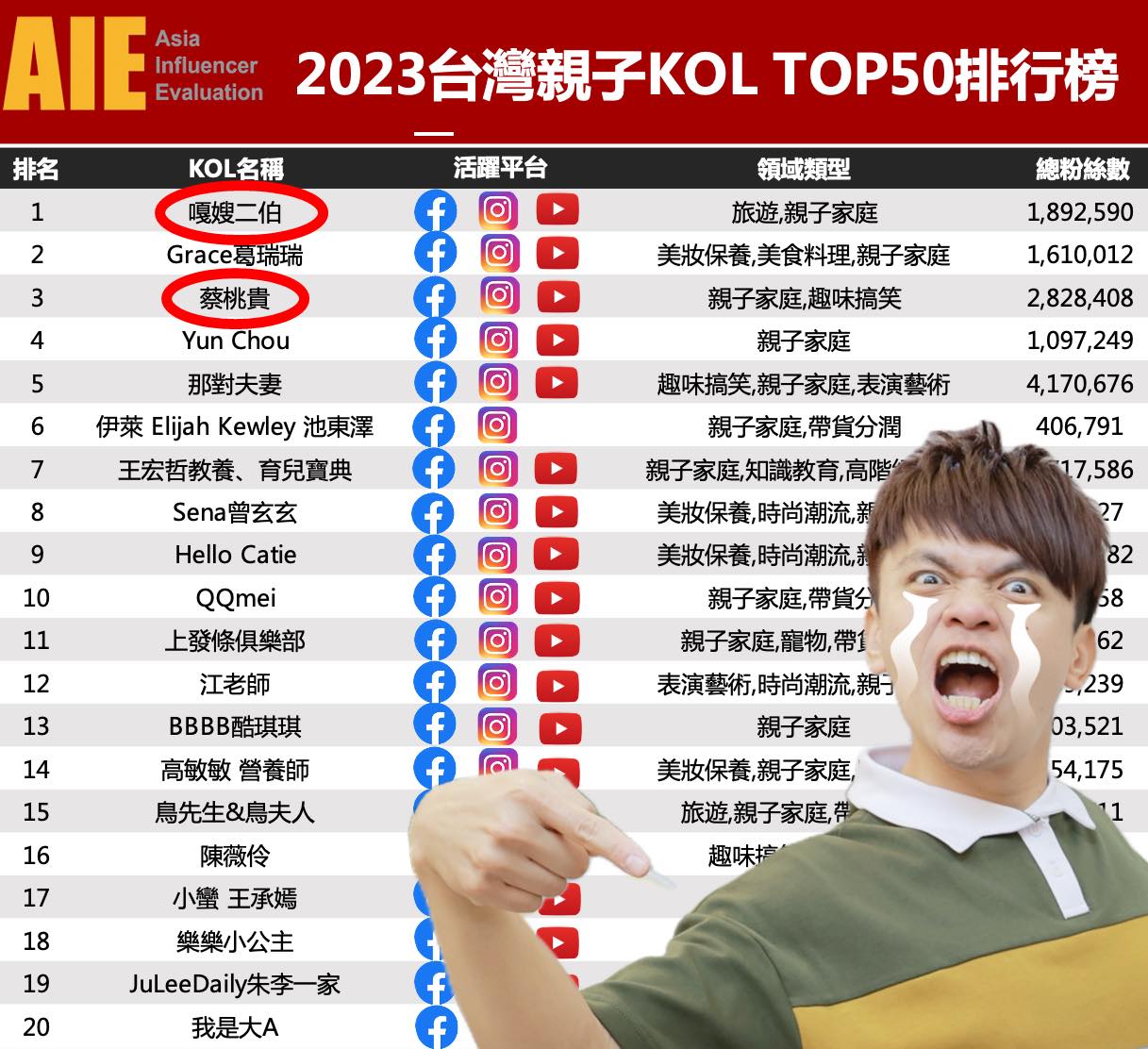 蔡阿嘎4日分享「2023年台灣親子KOL TOP50排行榜」的統計數據,第一名竟然就是老婆二伯,Facebook、Instagram及YouTube三個平台加起來的粉絲數將近190萬,蟬聯第一名;蔡桃貴則位居第三名,總粉絲數更高達近290萬,相當驚人。