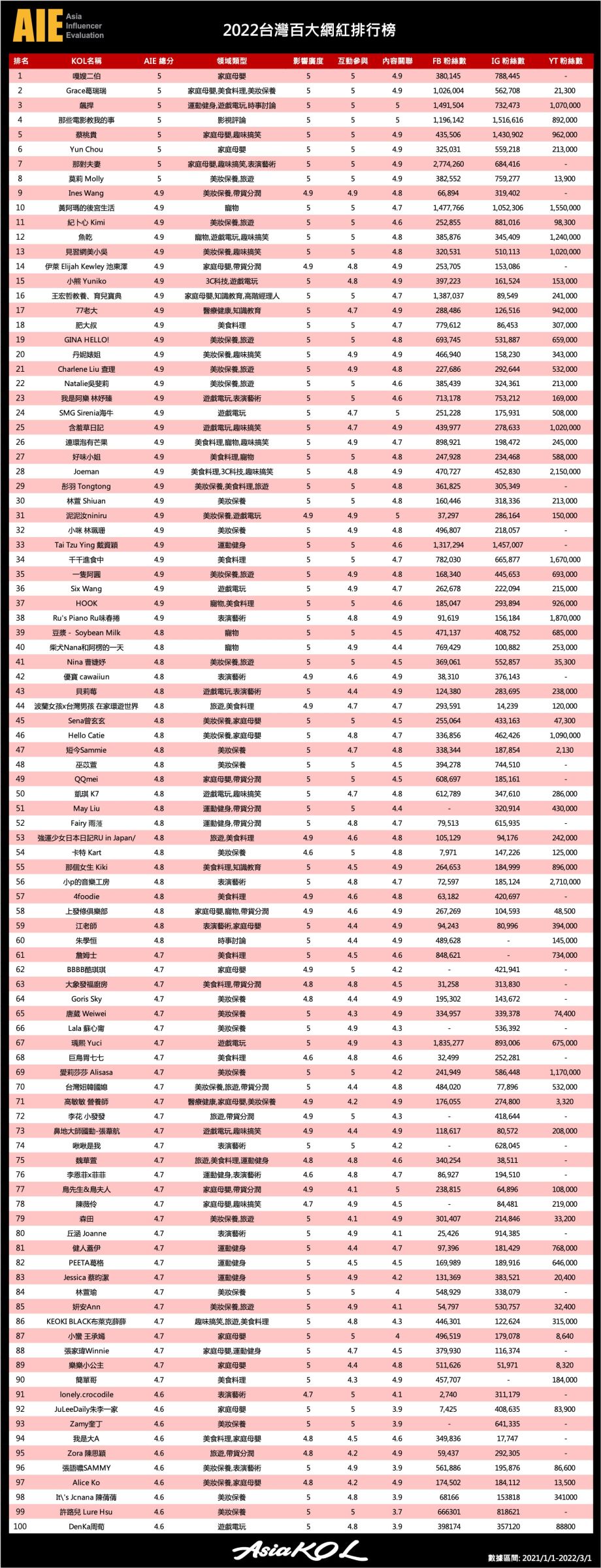 事實上,同一個單位曾在2022年排出台灣百大網紅,二伯同樣穩居第一名寶座,影響廣度、互動參與都是滿分,內容關聯也有高達4.9分;蔡桃貴的排名則是緊追在後,在眾多競爭者中排名第五,是滿分群中年紀最小的網紅,反觀蔡阿嘎還是沒有上榜。