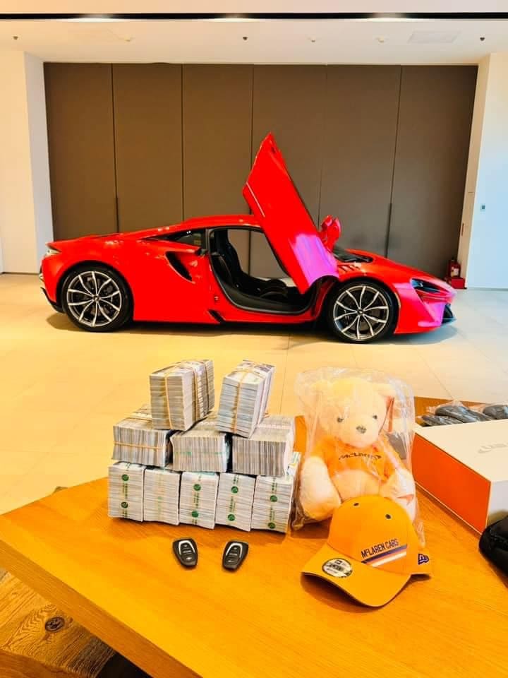 超哥在2021年3月下訂麥拉倫,直到今年11月才順利交車,他為了付1000萬尾款,特地跑了許多家銀行才湊齊錢。至於為什麼不用匯款的方式付錢,超哥表示:「小時候都會幻想過,幻想你有一天走進一個超跑專賣店,你就把現金放在桌上說:『今天我就要把這台車帶走』。」所以才會故意做這件事,算是完成一個人生里程碑。