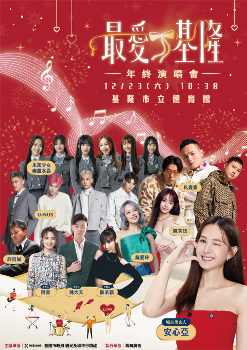 謝國樑市長表示,除了城市代言人,今年年終演唱會活動也是首創之舉,為大家帶來最豪華的表演陣容,除了陳大天、阿喜與陳若穎共組主持群,更邀請到7組超強卡司,包含城市代言人安心亞、首次來基隆表演的玖壹壹、鐵肺歌后戴愛玲、Kimberley陳芳語、U:NUS、未來少女-幽靈水晶、城市音樂愛心大使鋼琴家許哲誠等堅強陣容,要在今年冬天為大家帶來滿滿的溫暖。