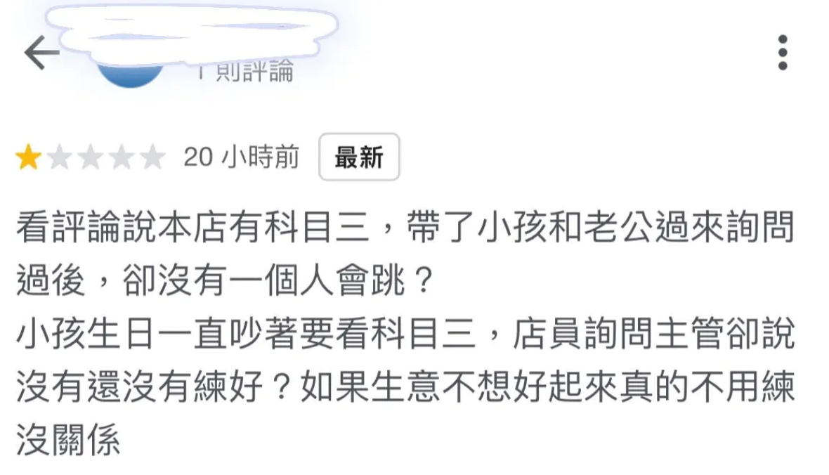 有家長在Google評論留下一星負評,氣沖沖地說:「看評論說本店有科目三,帶了小孩和老公過來詢問過後,卻沒有一個人會跳?小孩生日一直吵著要看科目三,店員詢問主管卻說沒有還沒有練好?如果生意不想好起來,真的不用練沒關係。」對此,網友將評論放到Dcard上發起討論,並直言:「員工根本沒有義務去跳舞給你看,大家都是出來為了生活工作的,更何況他們的工作內容是服務,而不是『才藝表演」。」