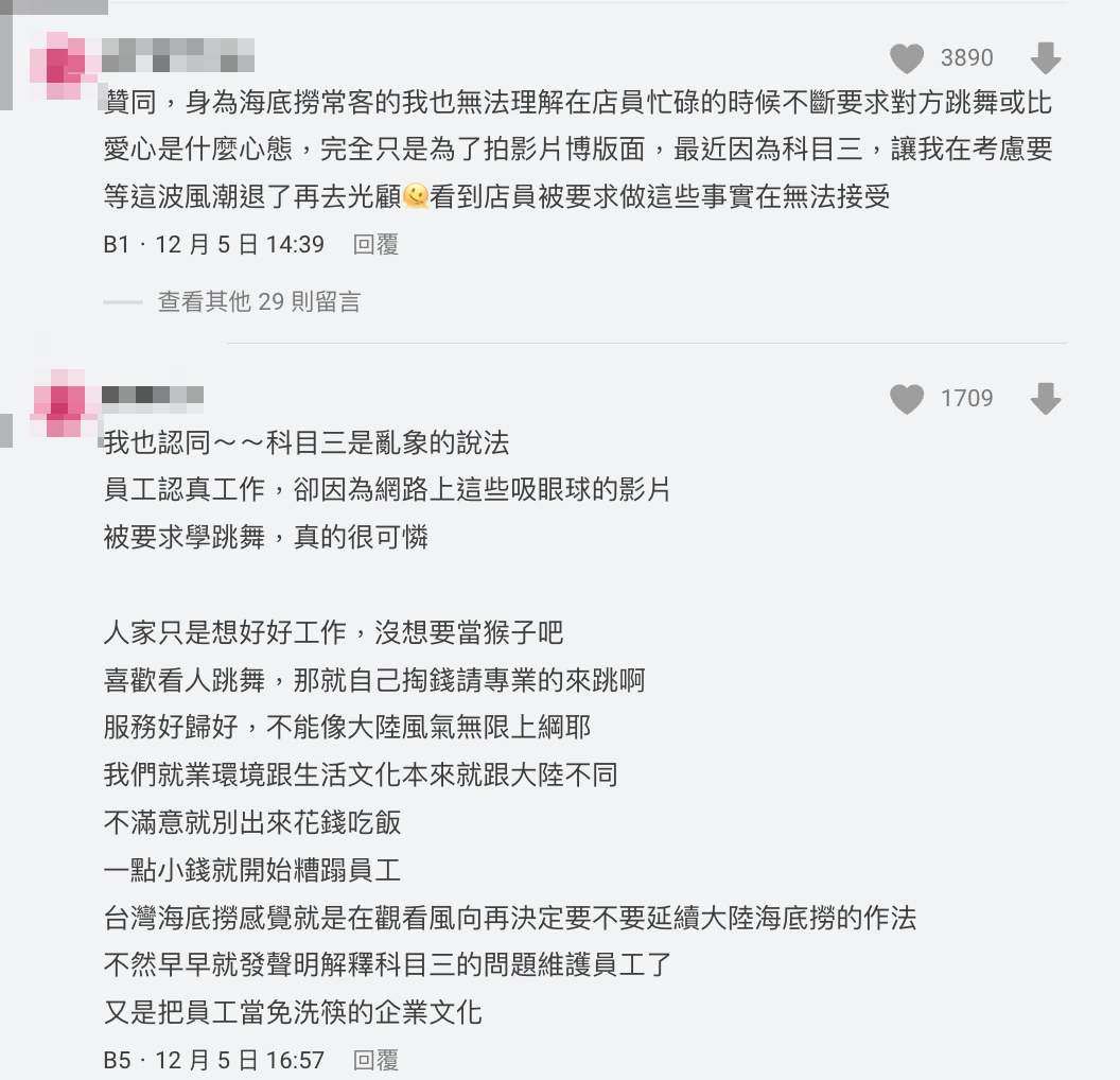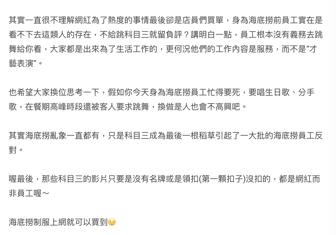 原PO認為海底撈的亂象一直都存在,只是〈科目三〉成為了最後一根稻草,引起許多員工的不滿,更指出網路上很多影片都是「網紅」裝扮成員工,服裝沒有符合上班標準。針對「不想跳就離職」的言論,原PO不滿回擊:「有些台灣分店沒有要求服務員學啊!」