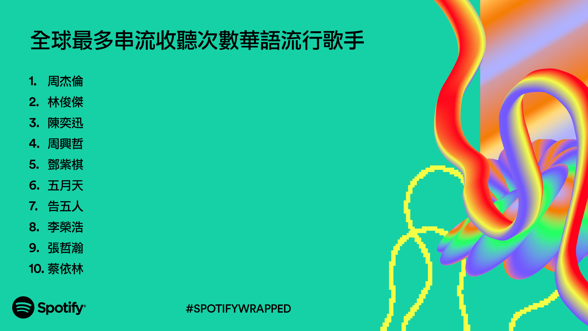 數十年來長期受到喜愛的林俊傑、陳奕迅與蔡依林持續吸引著聽眾,同樣在全球最多串流收聽次數華語歌手排行榜名列前茅,佔據第二、三、十名的位置。除了這些華語流行音樂巨星外,為聽眾帶來新鮮感的周興哲及告五人等潛力新秀也分別登上第四名與第七名的位置。