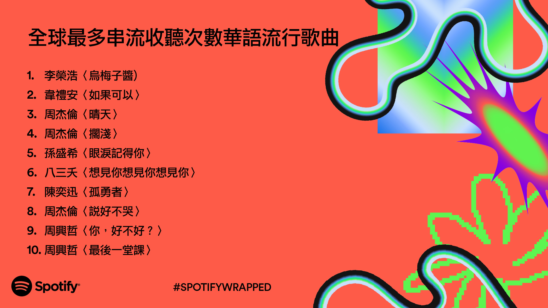 今年度全球最多串流收聽次數華語流行歌曲為李榮浩的〈烏梅子醬〉。在全球最多串流收聽次數華語流行歌曲前十名中,就有五首是熱門影劇中的歌曲,展現華語流行音樂對文化的關鍵重要性,包含第二名的韋禮安〈如果可以〉、第五名的孫盛希〈眼淚記得你〉、第六名的八三夭〈想見你想見你想見你〉,以及周興哲分別名列第九、十的〈你,好不好?〉和〈最後一堂課〉。