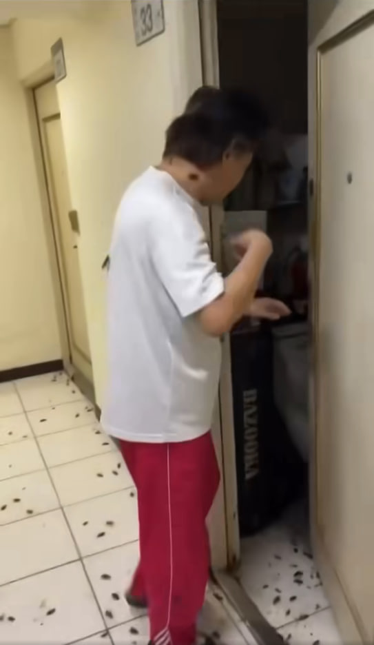 沒想到更可怕的還在後頭,他們發現這些蟑螂疑似都是從同一間房間竄出,正當他們在懷疑時,有位身穿白衣紅褲的男子稀鬆平常地經過蟑螂堆準備回到該房間,面對滿山滿谷的蟑螂他就像若無其事一般散步回到了房間,更可怕的是該男子的脖子及背上都還有蟑螂爬行,他絲毫沒有一點緊張的情緒便輕輕地拍掉身上的蟲子淡定的回到了房間。