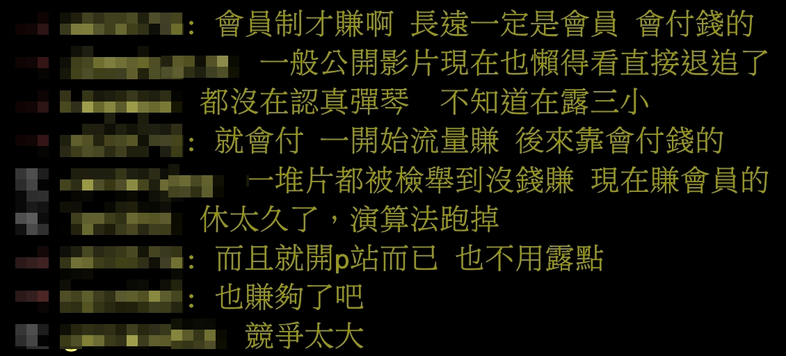 對此,網友紛紛表示:「東西久了都有倦怠」、「觀眾去看新的嫩妹了」、「再看露也就那樣而已」、「現在尺度更大的多的是了」,還有人認為有可能是小P停更太久,雖然現在已經恢復更新,但卻變得不容易被演算法推出去,再加上內容沒有新鮮感,才導致觀眾外流。
