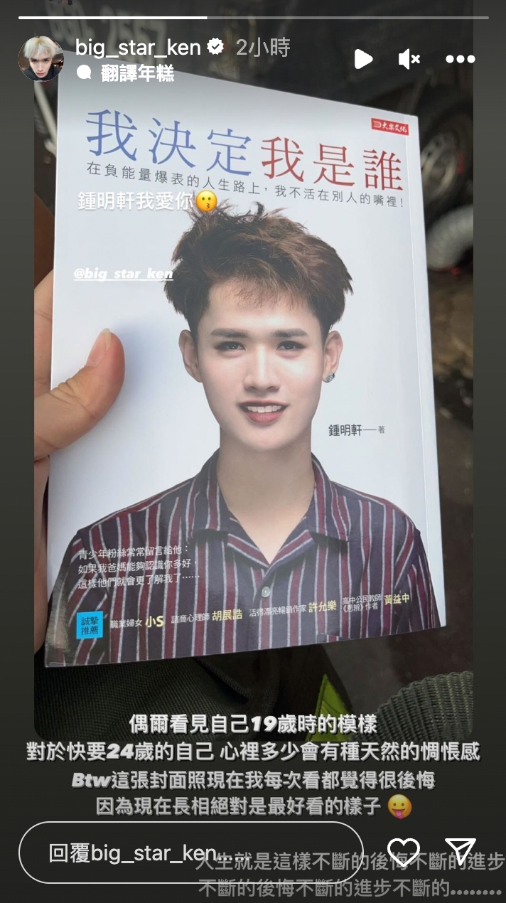 鍾明軒15日在IG限時動態轉發網友標記的動態,只見對方秀出鍾明軒的第一本書《我決定我是誰》,還直球告白:「鍾明軒我愛你。」鍾明軒雖然沒有多做回應,但感慨透露拍攝書封照面的時候是19歲,時間已經過去近5年,轉眼間已經即將24歲,因此難免有一點惆悵的感覺,並坦言:「這張封面照現在我每次看都覺得很後悔,因為現在長相絕對是最好看的樣子。」即使如此,他也明白人生就會不斷經歷後悔,接著進步,一直輪迴下去。