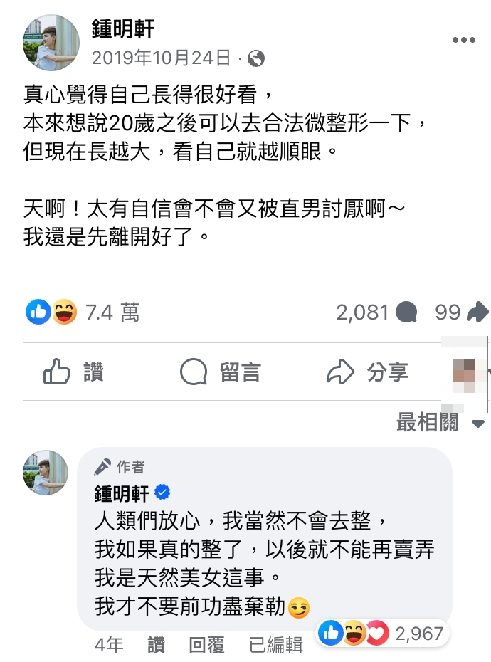 事實上,鍾明軒在出書當年就曾發文表示:「真心覺得自己長得很好看,本來想說20歲之後可以去合法微整形一下,但現在長越大,看自己就越順眼。」貼文曝光後,許多人都認為鍾明軒現在已經夠精緻,紛紛勸退他,他則要大家放心,「我如果真的整了,以後就不能再賣弄我是天然美女這事。我才不要前功盡棄勒。」