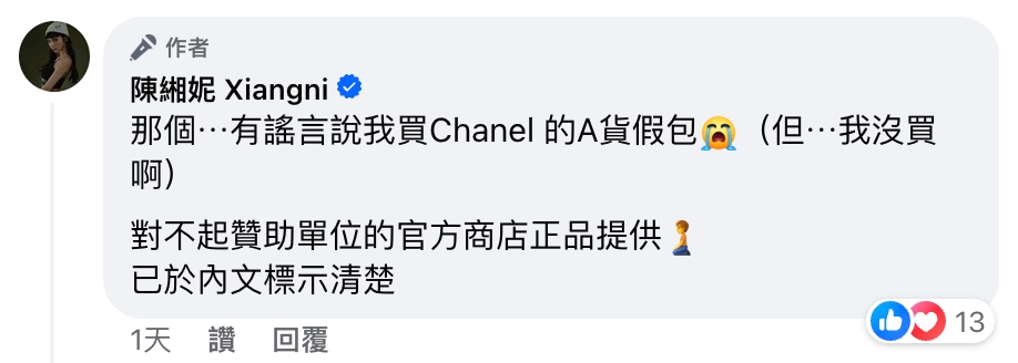 Keanna日前在社群平台開問答與網友互動,被問到「謝和弦夫妻不還錢是否能扣押名下財產」,她意有所指地說:「對方惡意不還錢可以實行扣押,例如她在淘寶買的幾千塊Chanel A貨假包。」對此,陳緗妮先是在17日表示:「那個…有謠言說我買Chanel的A貨假包(但…我沒買啊)對不起贊助單位的官方商店正品提供,已於內文標示清楚。」透露包包是由贊助單位在澳門香奈兒官方門市購買。