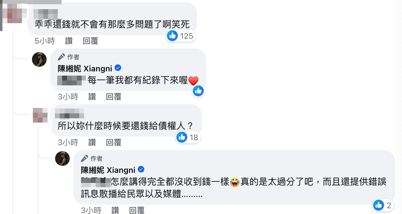 貼文曝光後,網友紛紛吐槽:「乖乖還錢就不會有那麼多問題了啊」、「妳公開記錄打她臉不就結束這一回合了嗎?」陳緗妮無奈表示:「怎麼講得完全都沒收到錢一樣,真的是太過分了吧。」也認為自己不需要公佈私領域的資料給大眾,反而希望大家能把注意力放在自己的工作上。