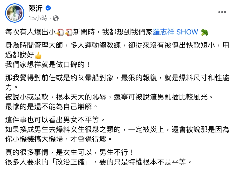 事情延燒幾天後,陳沂再度針對此事發表看法,她表示:「每次有人爆出小雞雞新聞時,我都想到我們家羅志祥。身為時間管理大師,多人運動總教練,卻從來沒有被傳出快軟短小,用過都說好!我們家想祥就是做口碑的!」針對羅志祥的砲火依舊猛烈。陳沂認為對前任或是約砲對象最狠的報復,就是爆料對方的尺寸跟性能力,「被說小或是軟,根本天大的恥辱,還寧可被說渣男亂插比較風光。」