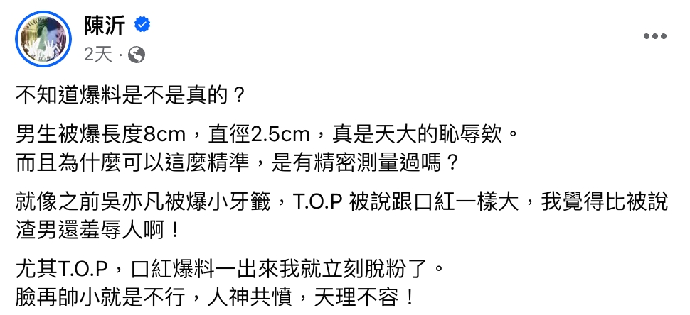 針對Amber的爆料文,陳沂第一時間就表示:「不知道爆料是不是真的?男生被爆長度8cm,直徑2.5cm,真是天大的恥辱欸。」更提到吳亦凡、T.O.P也曾被提及下體尺寸太小,讓她直接脫粉,更直言:「臉再帥小就是不行,人神共憤,天理不容!」