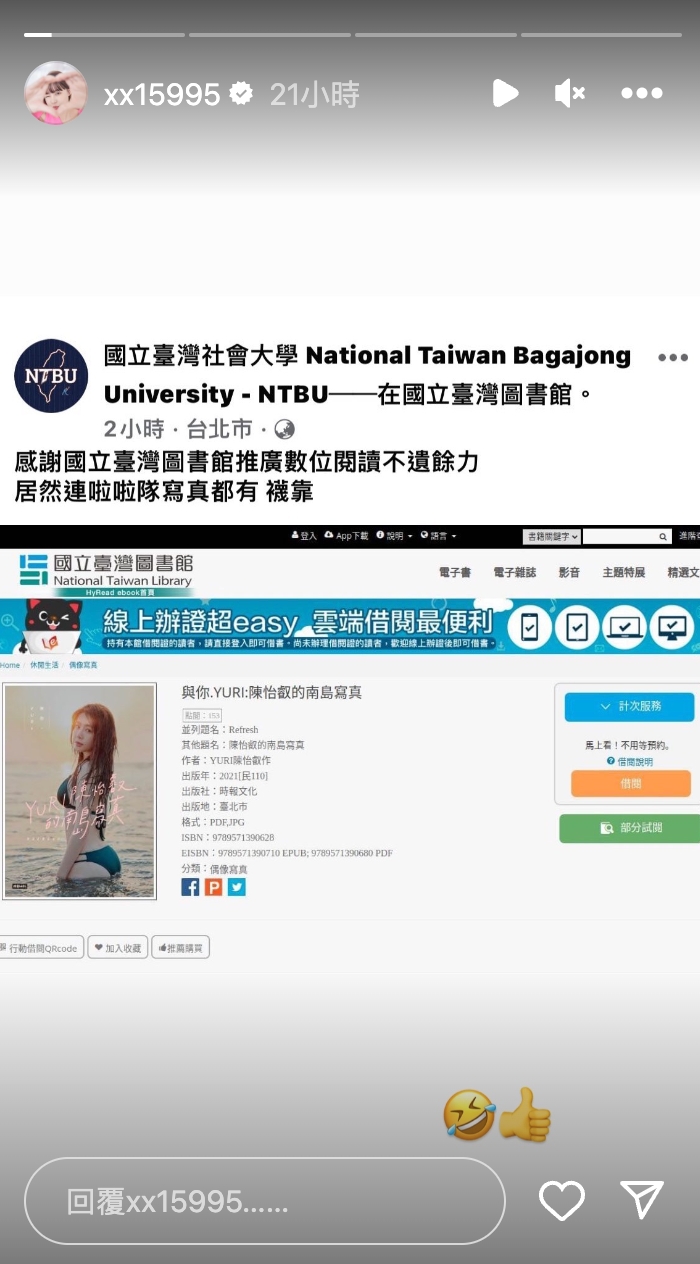 粉絲專頁「國立臺灣社會大學」19日發文:「感謝國立臺灣圖書館推廣數位閱讀不遺餘力,居然連啦啦隊寫真都有。」圖片中可以看到竟是Yuri在2021年發行的寫真,而且已經有153次的點閱。