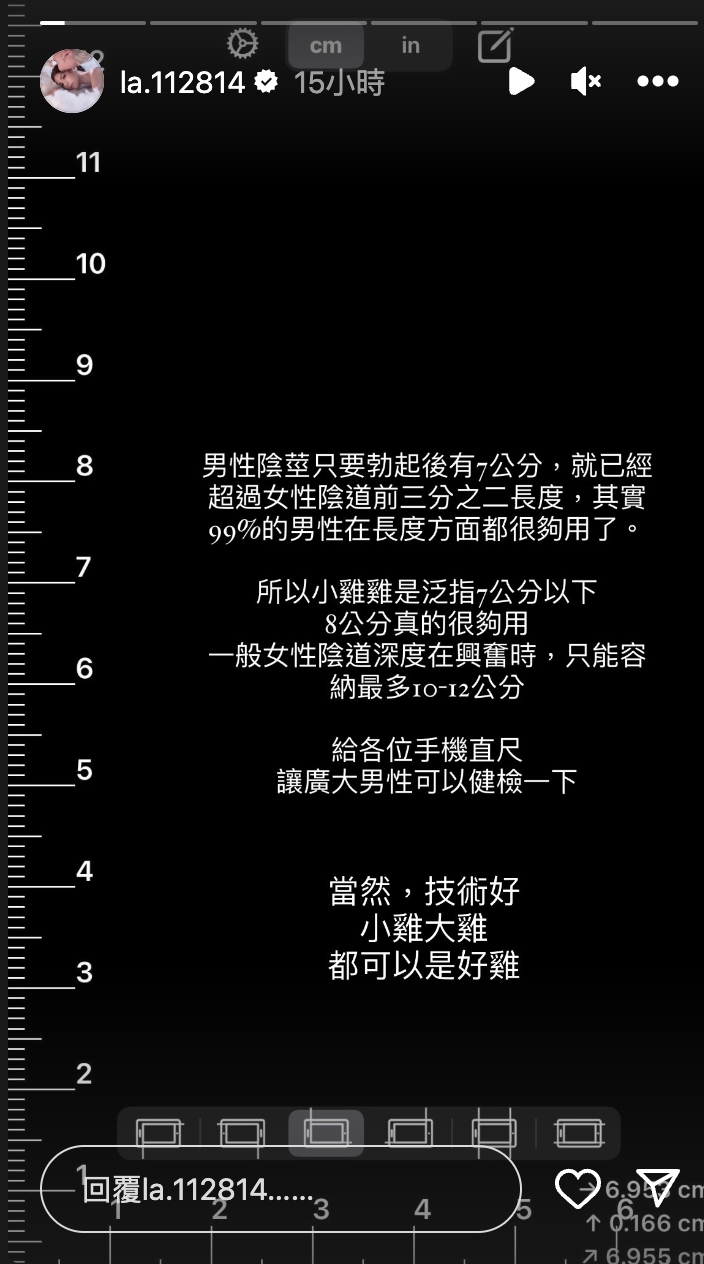 針對男生下體8公分到底會不會太小的問題,蕾菈透過IG限時動態表示:「男性陰莖只要勃起後7公分,就已經超過女性陰道前三分之二長度,其實99%的男性在長度方面都很夠用了。」所以7公分以下的長度才算是「小雞雞」,也認為8公分就已經夠用。蕾菈更進一步指出,「一般女性陰道深度在興奮時,只能容納最多10-12公分。」認為只要技術夠好,無論長短都可以是「好雞」。