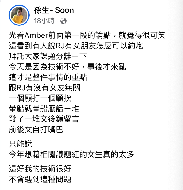除了蕾拉之外,孫生也發表自己的觀點,認為女方是因為嫌棄男方的技術不好,所以才會事後爆料,與阿傑有沒有女朋友無關,更狠嗆女方:「暈船就暈船廢話一堆。」最後還自信地說:「還好我的技術很好,不會遇到這種問題。」