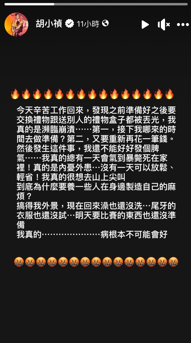 小禎21日透過限時動態表示,工作結束回到家後,發現之前準備好的交換禮物跟包裝盒全被丟掉,她直呼:「我真的是瀕臨崩潰」。小禎透露接下來不僅沒有時間準備,而且又要再花一筆錢,而且還要壓抑住怒火,不能好好發脾氣,她氣炸表示:「我真的總有一天會氣到暴斃死在家裡!」認為自己沒有一天可以好好放鬆,很想去山上尖叫舒壓。