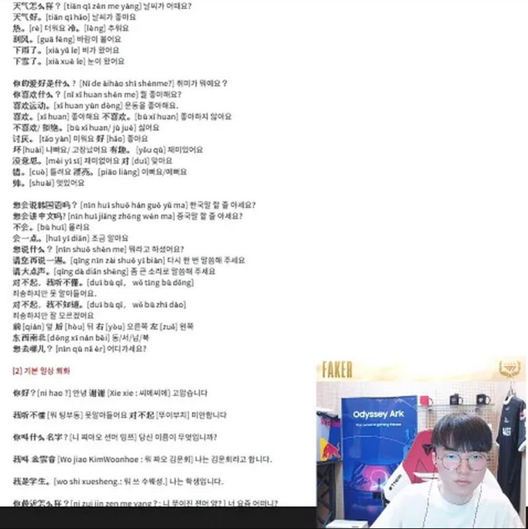 但在比賽的過程中,Faker竟邊打邊不斷切換視窗到Google 翻譯了解中國觀眾的留言,甚至當場學起中文長是與觀眾們對話打招呼,除此之外他更在交流賽的過程中打開了一份中文教材,學習中文的日常用語,學了幾段話之後再回到遊戲中比賽,值得一提的是就算Faker分神去學習中文,Faker 所在的 A 隊還是可以說是五路全面壓制,大獲全勝。