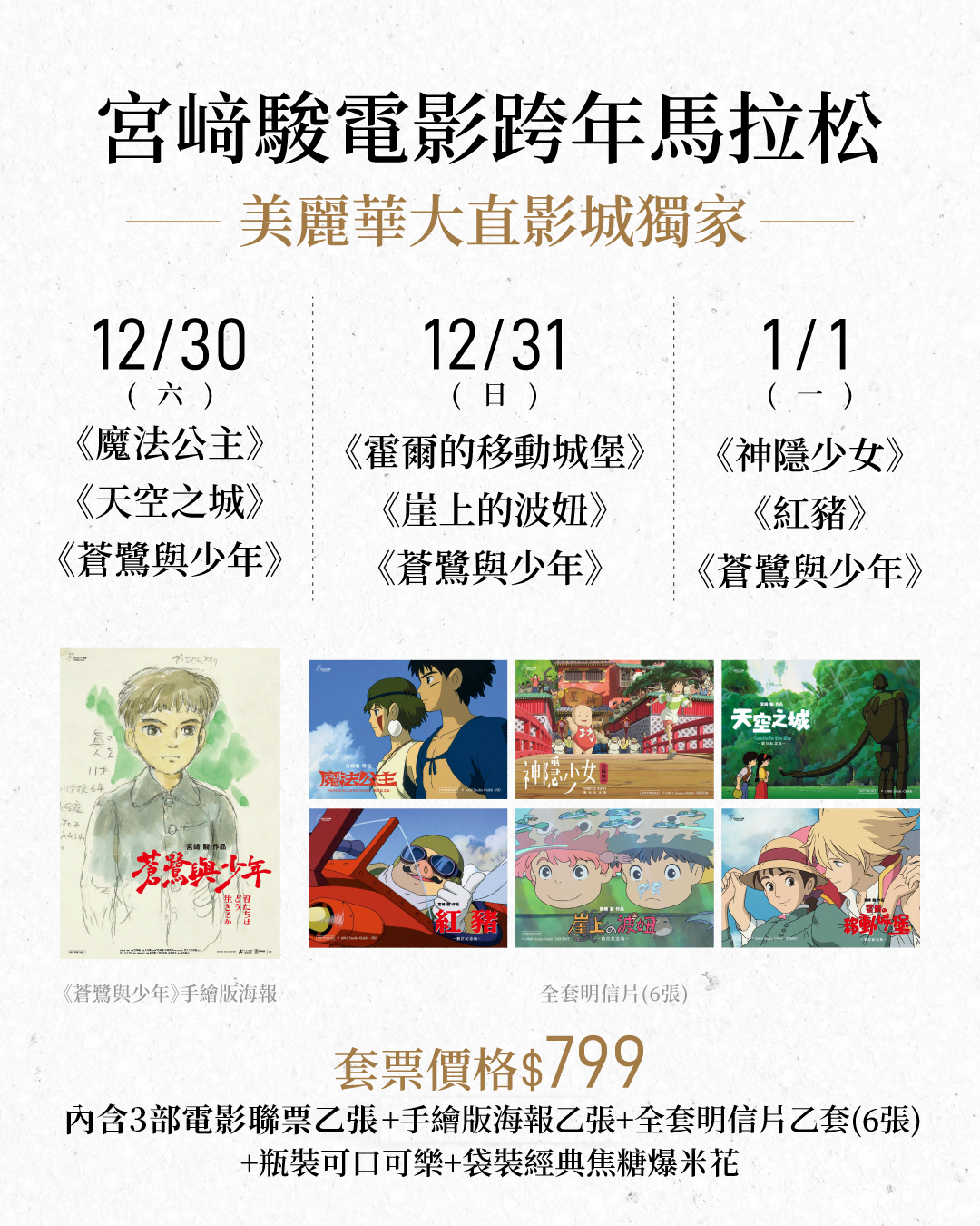 日本動畫大師宮﨑駿醞釀7年的集大成力作《蒼鷺與少年》全球賣座、橫掃國際獎項肯定,2023無疑是豐收的一年,電影致敬許多過往經典作品,令吉卜力迷津津樂道。台灣片商甲上娛樂與美麗華大直影城獨家合作推出「宮﨑駿電影跨年馬拉松」活動,精選《霍爾的移動城堡》、《崖上的波妞》、《神隱少女》、《魔法公主》、《天空之城》、《紅豬》六部電影搭配《蒼鷺與少年》,限定12/30、12/31、1/1放映3天,購票加贈宮﨑駿手繪「真人」草稿原畫海報及6張全套明信片組,讓台灣觀眾在宮﨑駿作品陪伴下送舊迎新,2024繼續發光發熱。