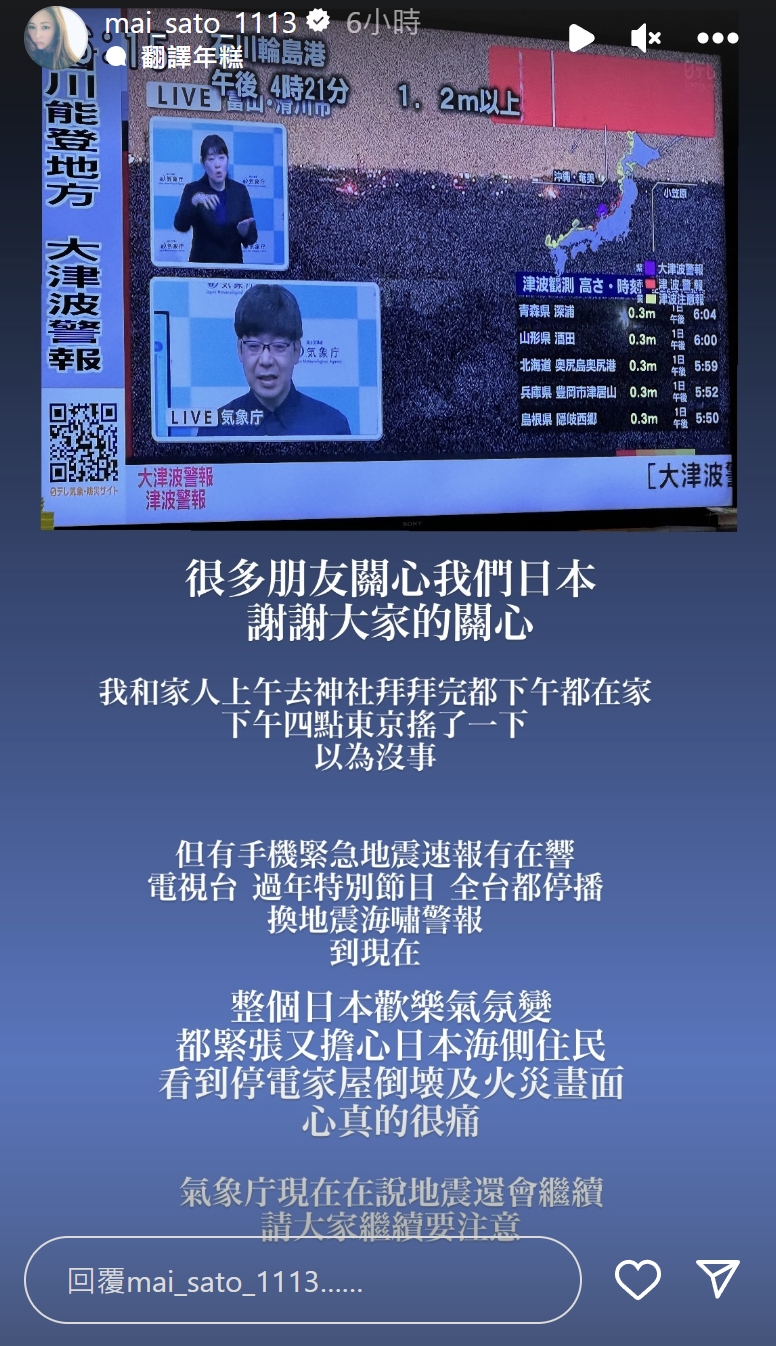 地震發生之後,麻衣就透過IG發文報平安,她透露早上跟家人去神社拜拜之後,下午都待在家,「下午四點東京搖了一下,以為沒事,但有手機緊急地震速報有在響,電視台、過年特別節目全台都停播,換地震海嘯警報。」由於正值元旦新年假期,原本氣氛很歡樂瞬間變成緊張又擔心。只要看見房屋倒塌跟火災的畫面,都讓麻衣覺得很心疼,最後也不忘提醒大家,「氣象廳現在在說地震還會繼續,請大家繼續要注意。」