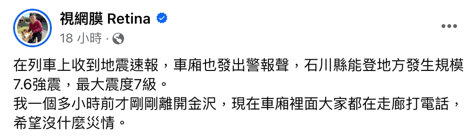 除了麻衣之外,網紅視網膜也剛好在日本旅遊,他透露一個小時前才剛離開石川縣,事發當時人剛好在列車上,立刻就收到地震速報,車廂也有發出警報聲,「現在車廂裡面大家都在走廊打電話,希望沒什麼災情。」視網膜也透露自己順利抵達京都,但是後一班列車因為地震而被破取消,讓他直呼:「太驚險!」