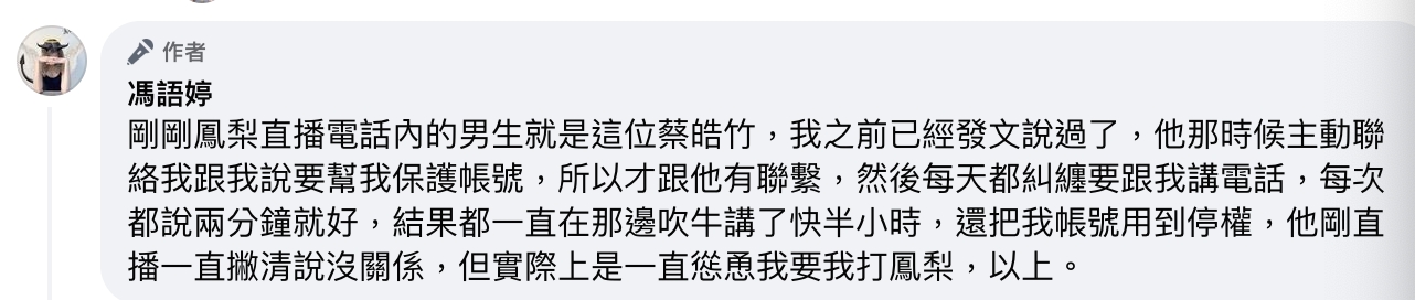 鳳梨在直播中放出與馮語婷帳號創辦人的電話錄音,聲音竟是一位男性,他解釋已經將帳號轉給一對夫妻,所有事情都跟他沒有關聯,但顯見鳳梨並不相信。鳳梨表示自己原本不想開直播,但是很多人一直說馮語婷是一個柔弱嬌小、楚楚可憐的女生,所以他才開直播揭穿真面目,並直言:「根本沒有這個人」,透露對方根本是一個男生。