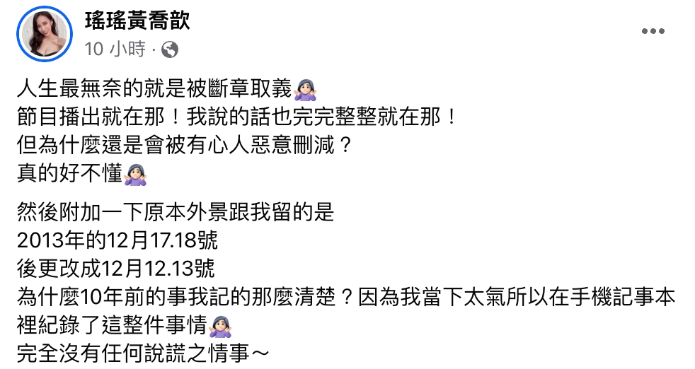 節目曝光後,相關片段遭到網友斷章取義,黃喬歆為此氣憤表示:「節目播出就在那!我說的話也完完整整就在那!但為什麼還是會被有心人惡意刪減?」她還直接公佈原本跟更改後的時間點,證明所言不假,並表示雖然是10年前的事情,但因為當下太生氣,所以才紀錄在手機裡,並強調:「完全沒有任何說謊之情事~」