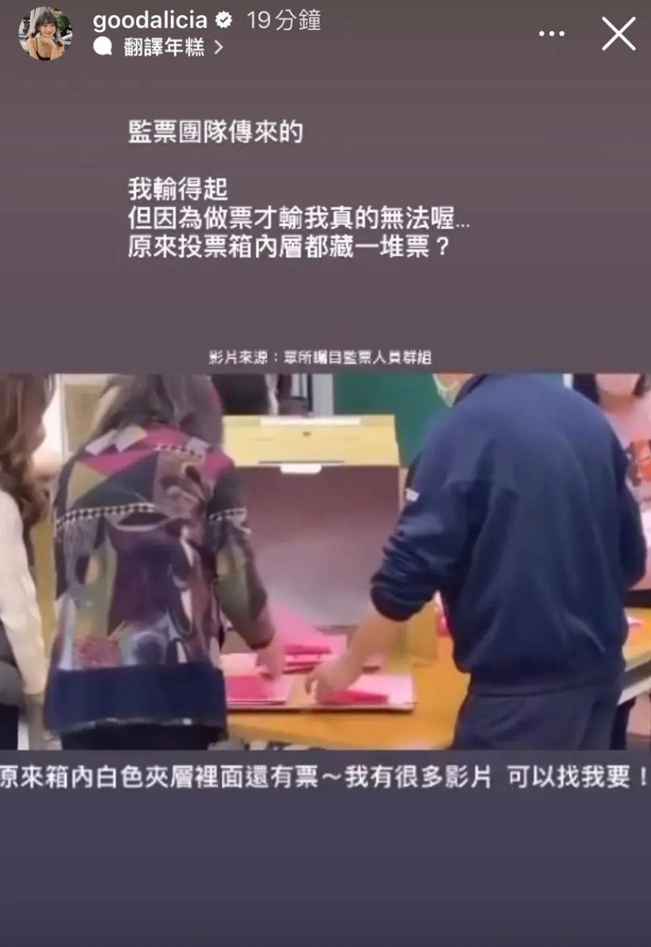 在開票過程結束後,愛莉莎莎一連發了多則動態質疑過程有問題,她表示:「我輸得起,但因為做票才輸,我真的無法喔…原來投票箱內層都藏一對票?」不僅如此,愛莉莎莎更質疑高雄市三民區跟左營區的民眾黨政黨票少了200票等。不過,這些影片僅有片段畫面,主要來自TikTok、臉書社團等,都是未經查證的內容。