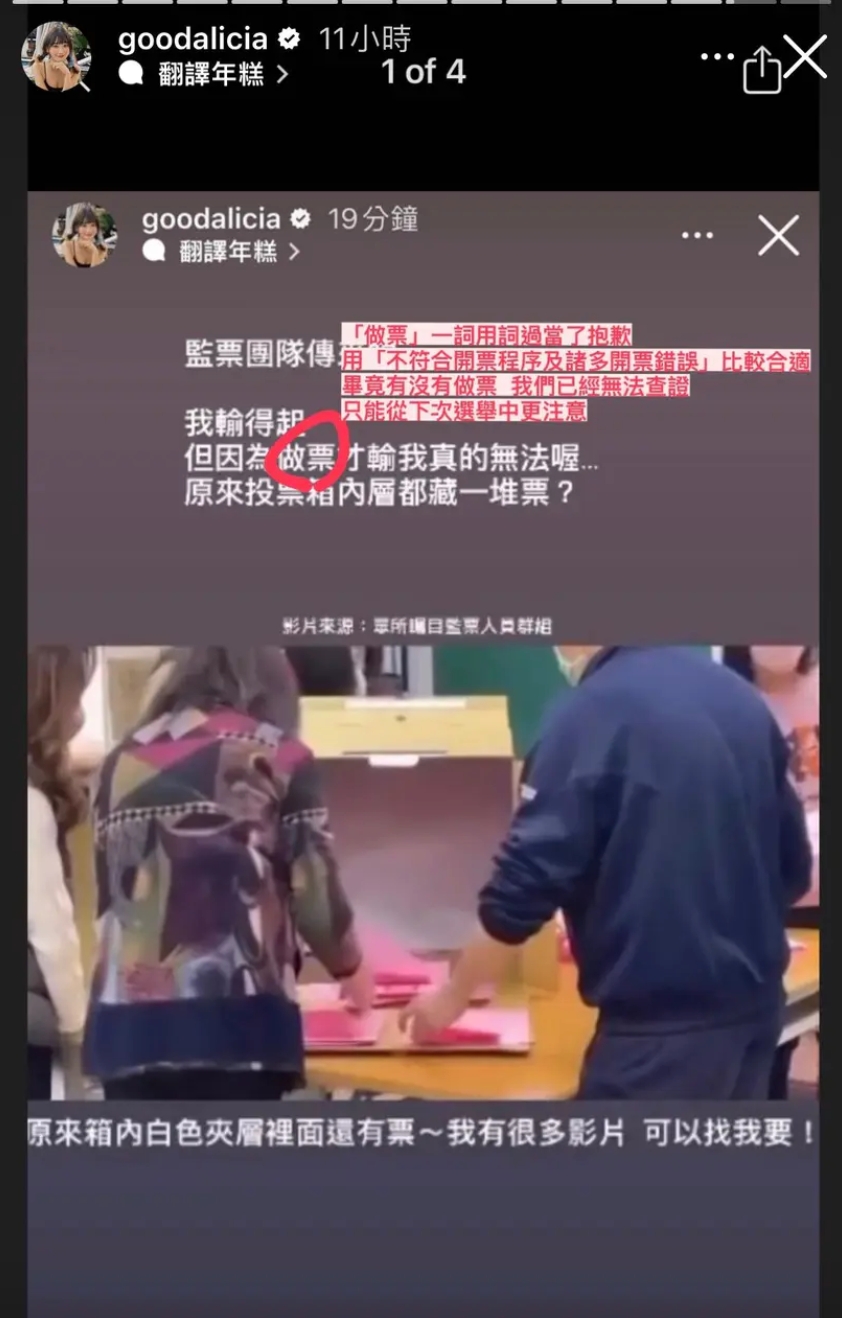 對此,愛莉莎莎道歉,坦言使用「做票」一次過當,使用「不符合開票程序及諸多開票錯誤」才合適,並補充解釋:「畢竟有沒有做票我們已經無法查證,只能從下次選舉中更注意。」