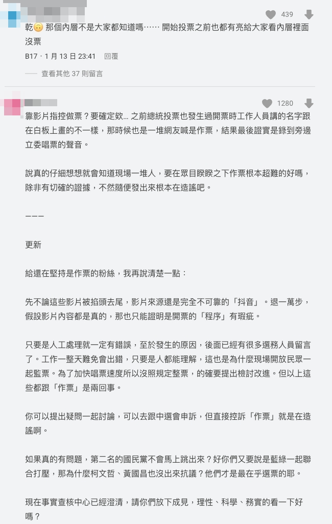 貼文曝光後,立刻引起許多網友的不滿,針對愛莉莎莎指出「做票」一事,有網友曬出「台灣事實查核中心」的文章佐證,證明是烏龍一場;至於政黨票是否有誤,根據中央選舉委員會官網的資料顯示,票數統計沒有錯誤。許多人痛批:「沒有查證就說是做票是造謠了吧?」、「查證很難嗎?」、「有些影片內容確實看起來計票流程有問題,但許多人直接咬定說是作票真的不太好。」