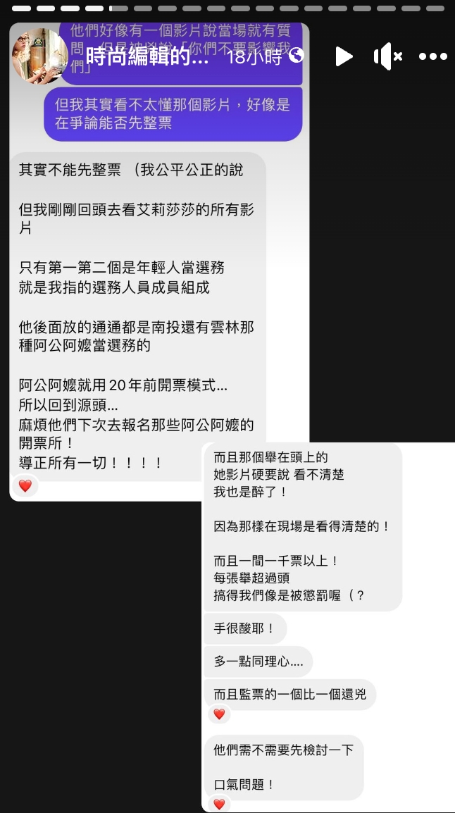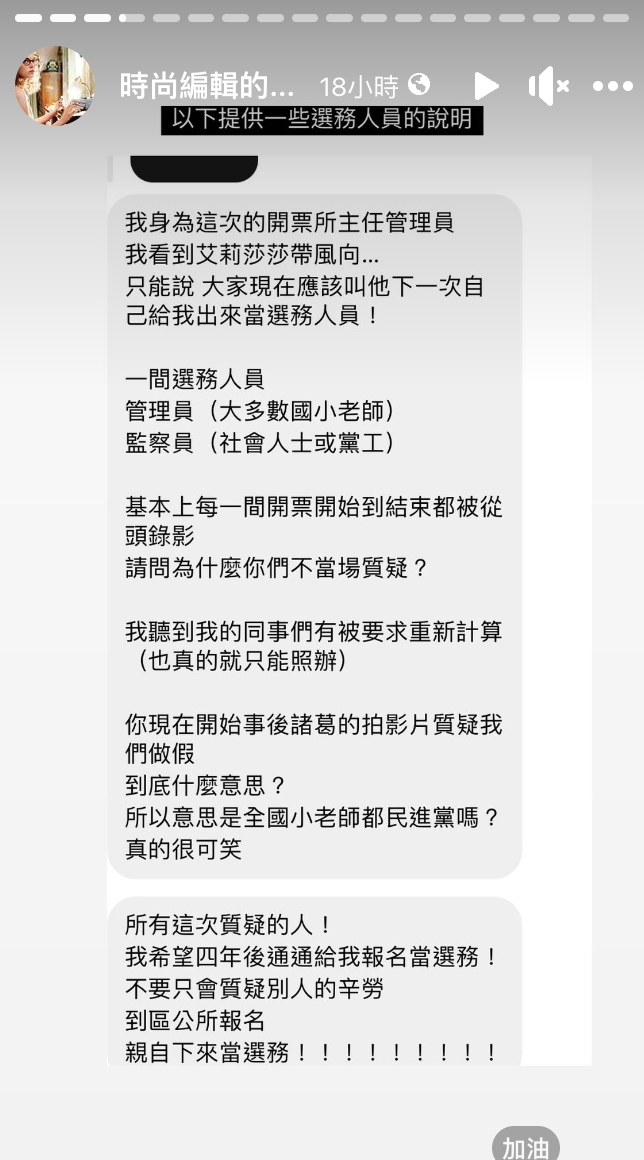 針對愛莉莎莎質疑做票一事,「時尚編輯的真心話」曬出一位自稱是開票所主任的分享,「我身為這次的開票所主任管理員,我看到艾莉莎莎帶風向,只能說大家現在應該叫他下一次自己給我出來當選務人員!」主任表示一間開票所是由管理員跟監查員組成,從開票到結束都被全程錄影,如果有問題應該要當場提出,而不是拍影片並且事後才說話,最後更氣憤地說:「所有這次質疑的人!我希望四年後通通給我報名當選務!不要只會質疑別人的辛勞,到區公所報名,親自下來當選務!」