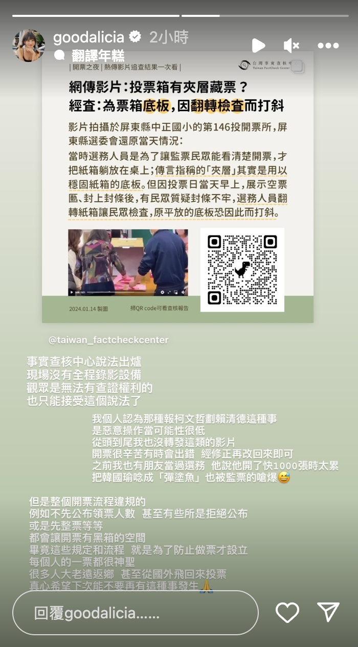YouTuber愛莉莎莎在總統大選結束後,一連發了多篇動態質疑開票不公,引起許多網友的不滿。對此,部落客「時尚編輯的真心話」曬出許多選務人員的心聲,其中一位還憤怒表示:「不要只會質疑別人的辛勞。」愛莉莎莎則二度回應了。