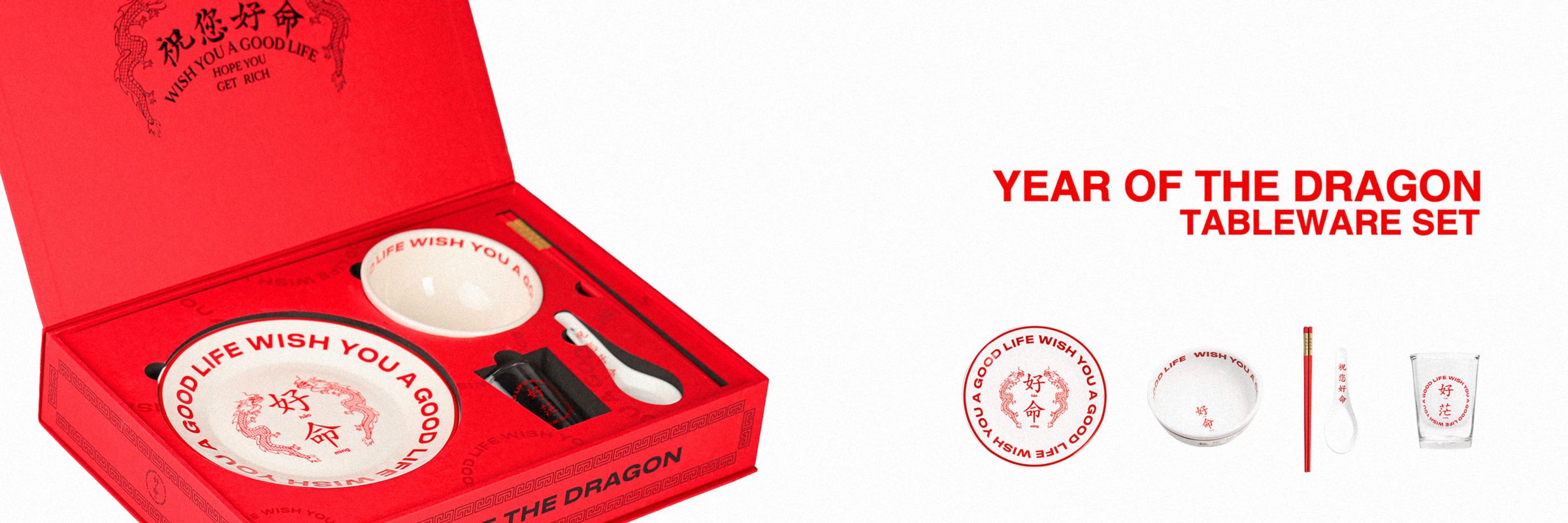 由周湯豪所創辦的「Wish You A Good Life 祝您好命」創意公司,再次引爆網路話題!2024年一月推出全新原創設計商品「WYAGL龍年限量碗盤禮盒組」,結合華人傳統過年文化,推出龍年限定的「好命龍」圖案碗盤,紅白碗盤的配色充滿節慶及文化感,由周湯豪團隊參與發想及設計。選在2024龍年推出全新商品對周湯豪來說別具意義,希望在象徵團圓的農曆新年間,自己和大家都能好好相聚一起吃頓飯,迎接蓄勢待發的一年。隨著首款自創商品發表,從未正式發售任何商品的「 祝您好命」官網同步上線,並首度招募會員,「WYAGL龍年限量碗盤禮盒組」將於2024 年 1 月 17 日 (三) 1:00pm在「 祝您好命」官網限量販售。
