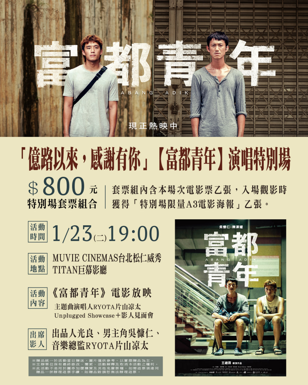 吳慷仁憑藉著《富都青年》精湛演技征服亞洲觀眾,陸續奪得多個影帝寶座,在別具意義的第六十屆金馬獎擒馬成功、晉升金馬影帝後,電影票房不斷飆升,除獎項肯定,吳慷仁也以透過勤跑影人場來回應所有觀眾的熱情支持,在破億前夕,與出品人光良、片山凉太出席全台唯一一場的「億路以來,感謝有你」《富都青年》演唱特別場,親自向每一個疼愛《富都青年》的觀眾致意,誠意十足。活動現場將由音樂總監片山凉太不插電自彈自唱插曲、電影主題曲〈一路以來〉,並與吳慷仁、出品人光良一同與現場觀眾互動問答,滿足大家的聽覺和所有對電影的好奇心。「億路以來,感謝有你」《富都青年》演唱特別場預售票即日起於博客來開賣,限量影迷珍藏套票組每套800元,內含1張電影票、隨票附贈特典海報1張,供影迷珍藏,數量有限、售完為止。電影《富都青年》現正熱映中。