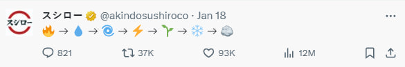 壽司郎在1月15日先是發出「?→?」這段匪夷所思的表情符號,後續後接連發出後續的「? → ? → ? → ⚡ → ? → ❄ → ?」(火、水、風、雷、草、冰、岩)表情符號,共六則神秘的貼文引發許多民眾討論究竟這地底有甚麼含意?