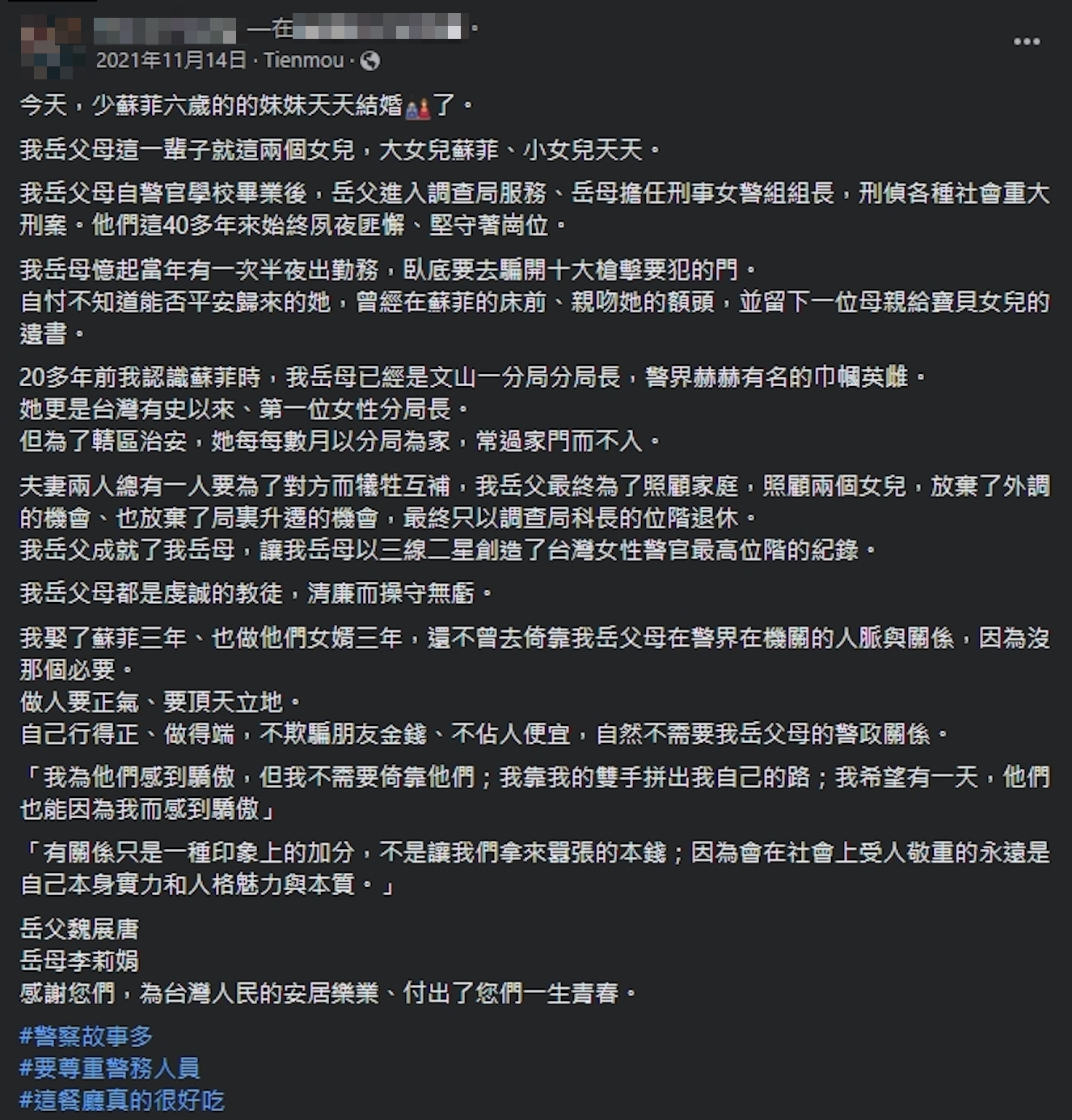 事實上,超哥早就在私人臉書以及影片中談過岳父、岳母的經歷,透露20多年前跟老婆蘇菲認識時,岳母就已經是文山一分局分局長,還是台灣有史以來第一位女性分局長。岳母當時為了轄區的治安,經常睡在分局內,更表示岳母有一次半夜出勤,當臥底去突襲10大槍擊要犯,由於不知道能不能平安歸來,所以臨走前偷偷地給了老婆蘇菲一吻,甚至還留下一封遺書。