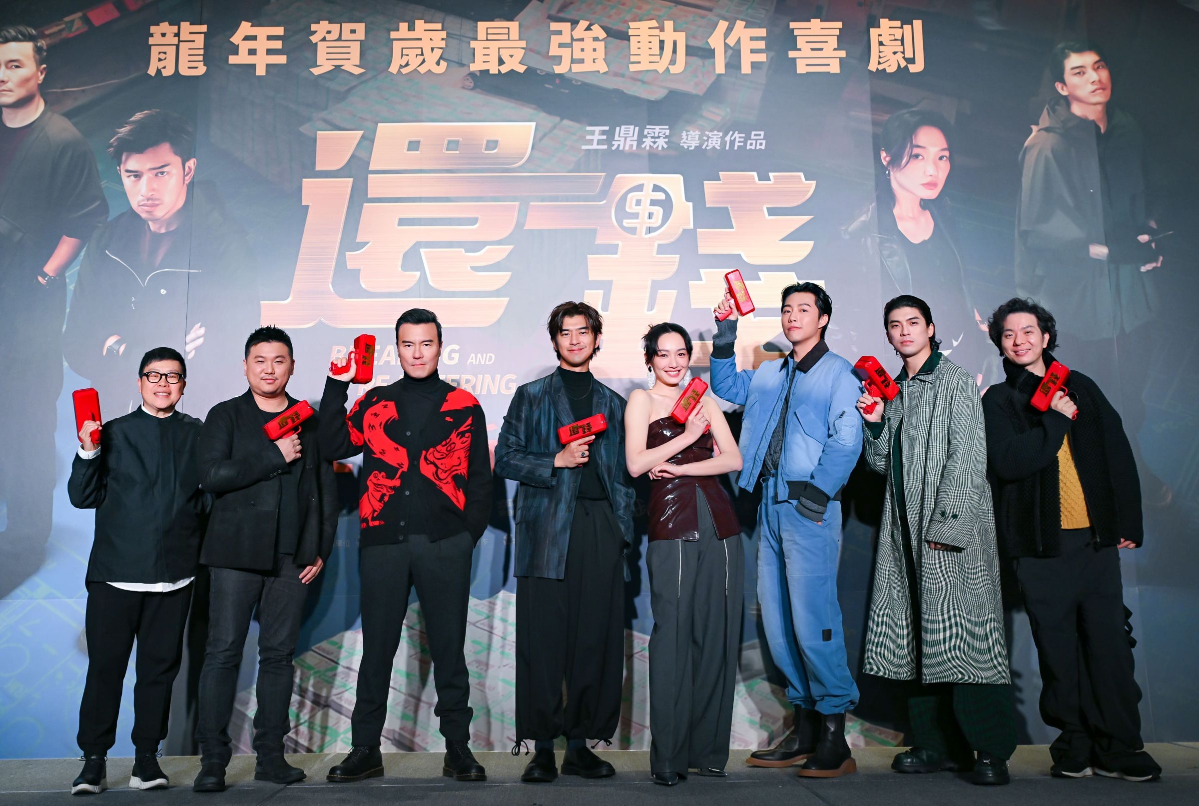 2024龍年賀歲最強檔動作喜劇電影《還錢》華麗集結陳柏霖、蔡思韵、李銘忠、林哲熹、蔡凡熙、吳慷仁等超強卡司,為《第九分局》新銳導演王鼎霖與億萬監製葉如芬、郝柏翔強強聯手的劫盜動作喜劇電影,今(1/22)記者會上監製葉如芬、郝柏翔及導演王鼎霖率領「4名大盜」竊盜集團陳柏霖、李銘忠、林哲熹、蔡凡熙及女主角蔡思韵盛裝出席,聲勢浩大。為了呼應片中的還錢金額高達10億元,眾人共手持8把發財噴鈔槍進行「豪灑10億鈔票雨儀式」,為電影上映祈求好兆頭,預祝票房大發,電影即將在2月8日小年夜全台歡樂上映。