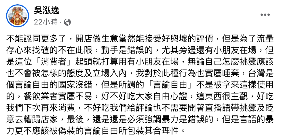 鳳梨認為即使台灣是個言論自由的國家,「但是所謂的『言論自由』不是被拿來這樣使用的」,也認為好不好吃是很主觀的感受,因此即使東西不好吃,「給評論也不需要開著直播語帶挑釁及貶意去糟蹋店家」。最後,鳳梨強調:「暴力是錯誤的,但是言語的暴力更不應該被偽裝的言論自由所包裝其合理性。」