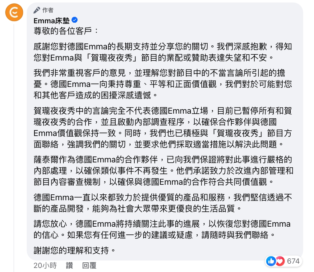 除了「台灣基進」以外,贊助商之一的Emma床墊也表示:「賀瓏夜夜秀中的言論完全不代表德國Emma立場,目前已暫停所有和賀瓏夜夜秀的合作,並且啟動內部調查程序,以確保合作夥伴與德國Emma價值觀保持一致。」同時已經積極跟製作單位聯絡,要求對方採取適當的解決方式。