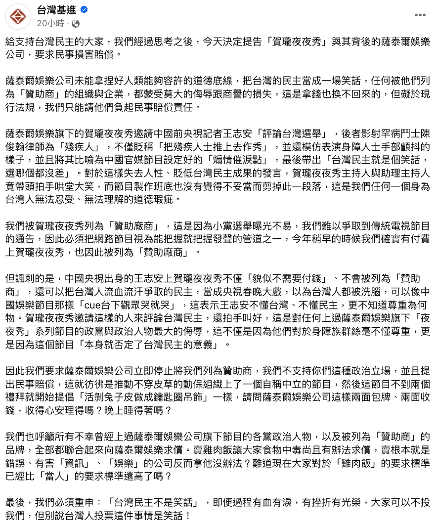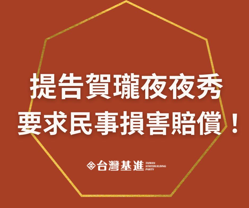 「台灣基進」24日透過臉書表示:「我們經過思考之後,今天決定提告『賀瓏夜夜秀』與其背後的薩泰爾娛樂公司,要求民事損害賠償。」直言薩泰爾沒有拿捏好道德底線,把民主當作笑話,導致被列為贊助商的組織與企業都蒙受巨大的侮辱跟商譽損失。「台灣基進」認為主持人帶頭拍手大笑,製作單位也沒有將片段刪除,「這是我們任何一個身為台灣人無法忍受、無法理解的道德瑕疵。」