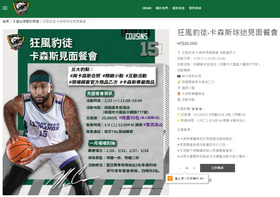 但或許是售價實在太貴,有球迷發現在官網該粉絲見面會竟還有48個名額,也就是說本次的見面會疑似目前只售出了2個名額,對此許多球迷開始熱烈討論,直呼:「會不會粉絲見面會變成三人聚餐?」、「2萬元才只能握手見面而以,魔獸來在夜市都有機會碰到他!」、「這次卡森斯的行銷真的有點失敗。」